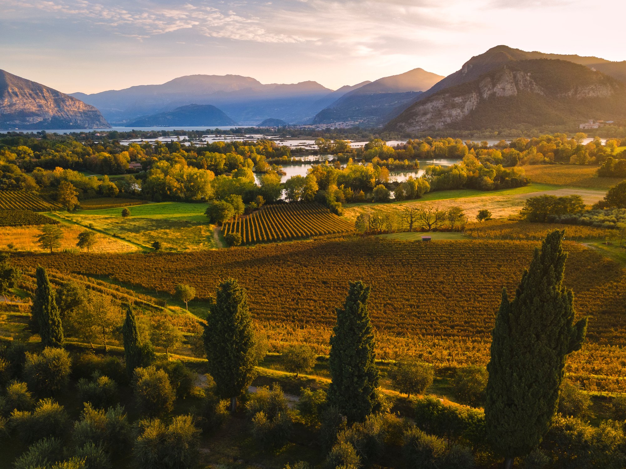 Franciacorta gets its flavours from its unique terrain. Lake Iseo is one of the glacial lakes in the region. The composition of the land, with its limestone, minerals and clay within the soil help create the tastes inherent in the sparkling wine of Franciacorta.