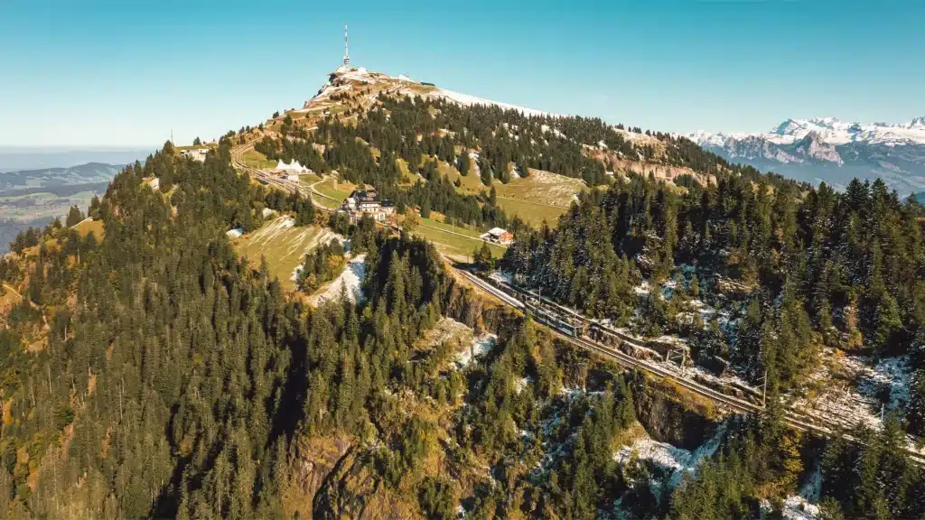 Often called the “Queen of the Mountains,” Rigi can be reached via a historic cogwheel train from Arth-Goldau or by boat and rail across Lake Lucerne. From the summit, you’ll be treated to alpine lakes and peaks stretching as far as the eye can see. Cogwheel Railway (Rigi Bahn) from Vitznau or Arth‑Goldau up Mount Rigi is a classic scenic rail experience with panoramic lake and mountain views.