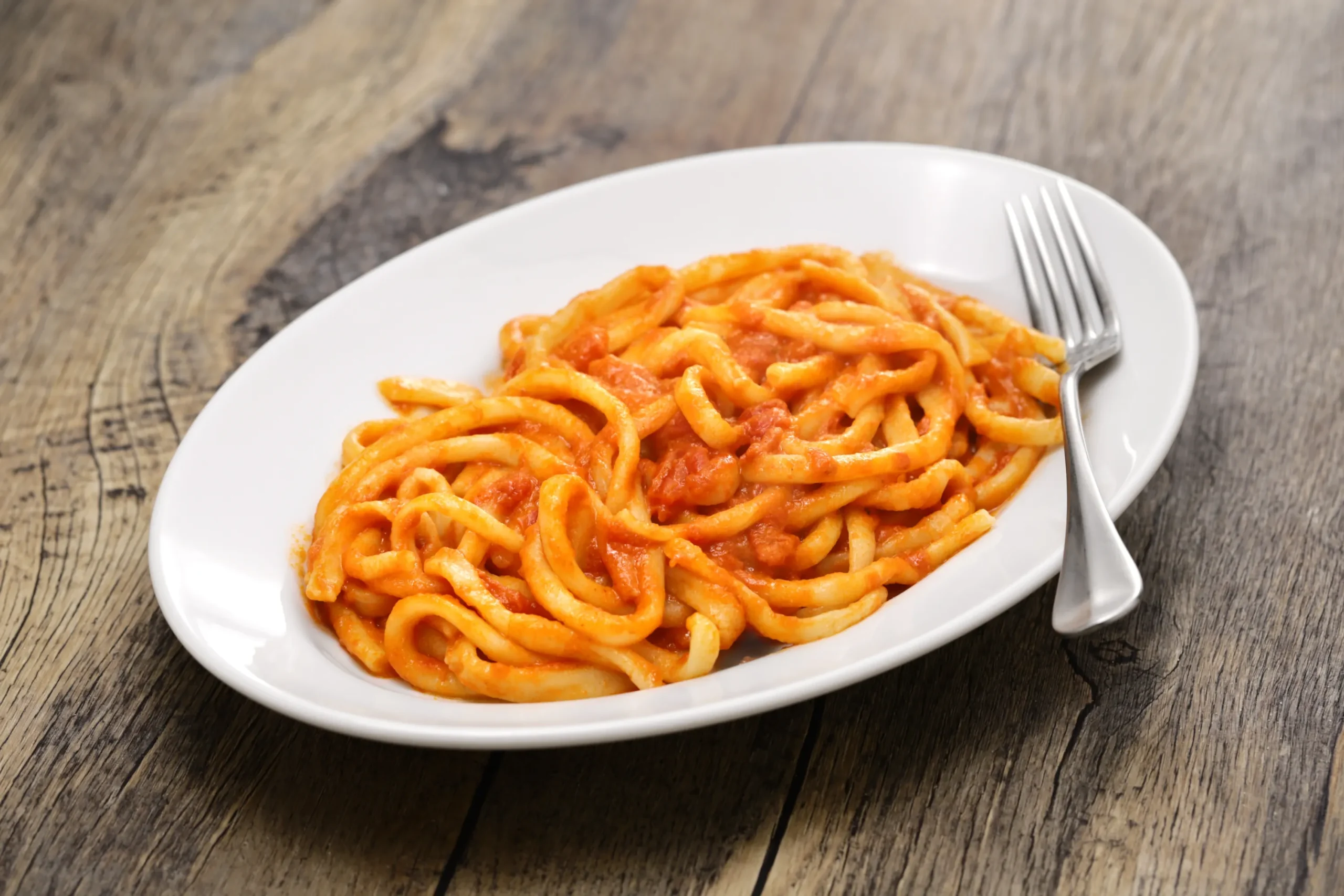 Pici all’aglione is a Tuscan fresh pasta recipe that is typical to Siena. Pici are thick hand-rolled spaghetti made with a simple flour and water dough, with an equally simple sauce. It’s made with tomato and “aglione”, which is a local type of garlic that has a much more sweet and delicate taste.