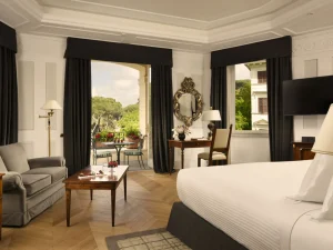 A 5 star hotel that was once a 19th Century palace, the property is classically styled in Rococo or late baroque. This is classic Rome inspired by the red, blue and yellow colourings of the Vatican Guard, with generous sized rooms elegantly furnished with plush fabrics, French furniture and marble bathrooms. The rooms are always clean and well maintained, as well as being spacious and luxurious, as you would expect from a 5 star hotel.