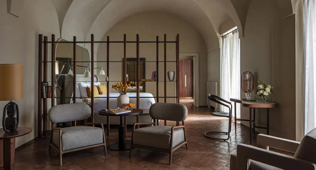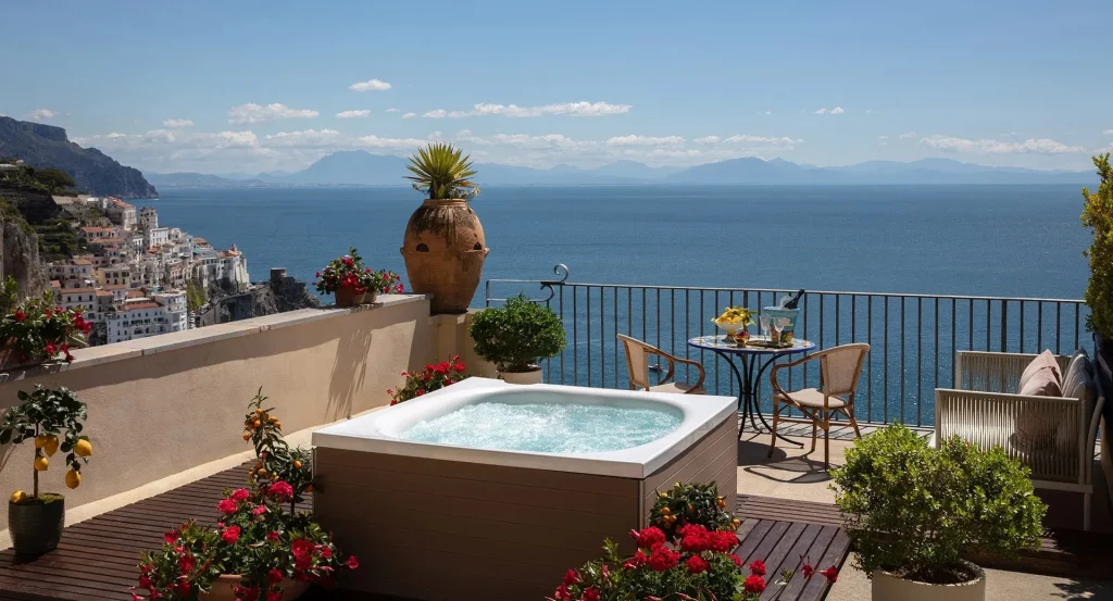 The hotel offers 52 elegantly appointed rooms and suites, each boasting sea views. The interiors feature minimalist white décor complemented by terracotta tile finishes, reflecting the region’s traditional aesthetic. Select suites are adorned with 19th-century frescoed ceilings, adding a touch of historical grandeur. Modern amenities such as complimentary Wi-Fi, wall-mounted LCD televisions, and marble bathrooms ensure a comfortable stay. Immerse yourself in the property’s historical charm by exploring the 13th-century Norman-Arab cloister and the “Passeggiata dei Monaci,” a scenic walkway offering panoramic coastal views. The hotel features two distinguished dining venues, Dei Cappuccini serving gourmet Italian cuisine in an elegant setting, and La Locanda, offering a more casual dining experience. You can relax in the heated outdoor infinity pool overlooking the Mediterranean Sea or rejuvenate at the on-site spa, which includes three treatment rooms and a sea-facing relaxation area. With its blend of historical significance and luxurious rooms, Anantara Convento di Amalfi Grand Hotel offers an unparalleled experience for those exploring beautiful Sorrento and the Amalfi Coast.