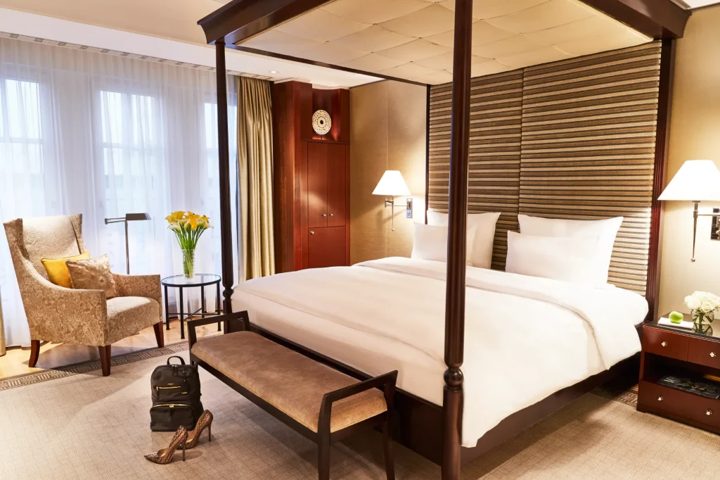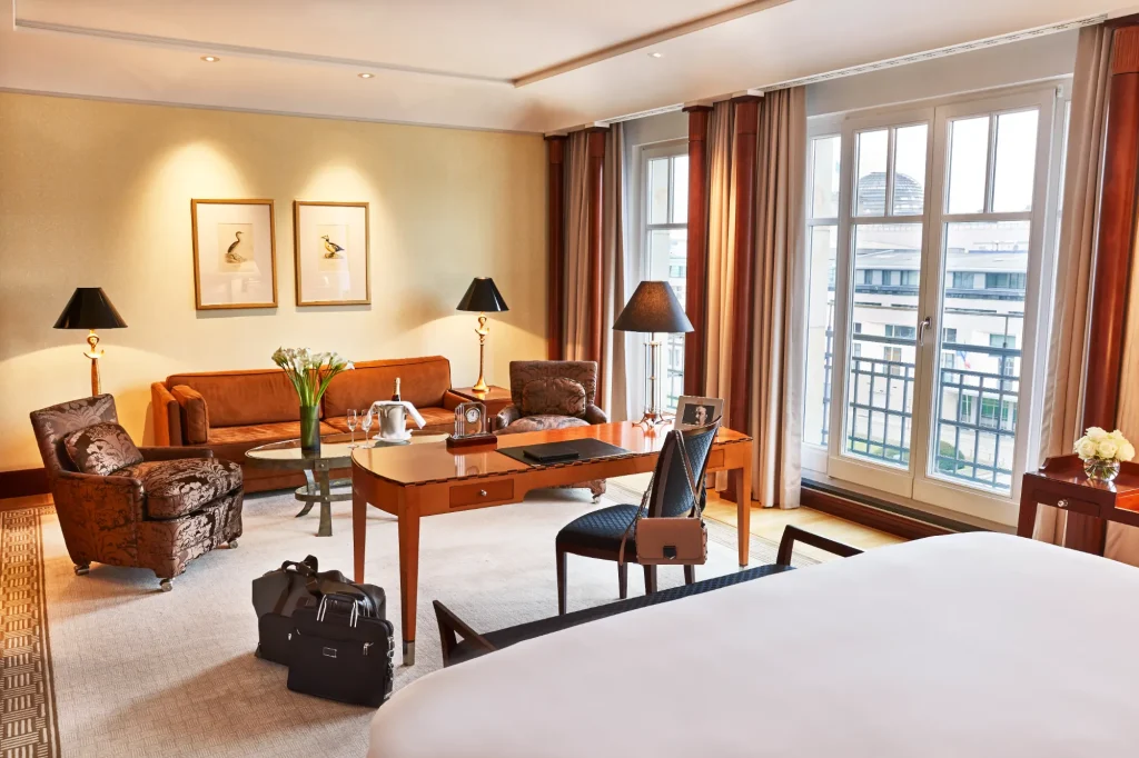 After being largely destroyed during World War II, the current structure was inaugurated in 1997, inspired by the original design. The hotel offers 385 rooms, including 78 suites, each combining timeless luxury with modern amenities. Accommodations are furnished with opulent décor, providing a comfortable and elegant retreat. Notably, the “Royal Suite” reflects the grandeur of 1920s Berlin includes a living room, study, dining room, 2 bedrooms and a luxurious bathroom equipped with a sauna, Jacuzzi and steam bath. The hotel offers a variety of dining options with a focus on exceptional quality and fine culinary experiences. Brasserie Quarré provides a more casual yet elegant atmosphere, where you can enjoy a blend of French and German cuisine with a menu featuring seasonal dishes, prepared with the finest ingredients, providing a balanced experience of comfort and sophistication. For a truly extraordinary gastronomic experience, Lorenz Adlon Esszimmer, the hotel’s 2-Michelin-starred restaurant, stands out. This fine-dining establishment offers a refined tasting menu that highlights top-tier ingredients and culinary artistry. Lorenz Adlon Esszimmer is known for its impeccable service and the creative flair of its chef, making it a must-visit destination for food lovers in Berlin. In addition to these options, the hotel also has a variety of lounges and bars, each providing an intimate setting to relax and enjoy expertly crafted cocktails and light bites. Indulge at the “Adlon Spa by Resense,” which offers a range of beauty treatments, massages, and wellness therapies, and features a heated pool, sauna, and fitness centre, ensuring a comprehensive wellness experience.