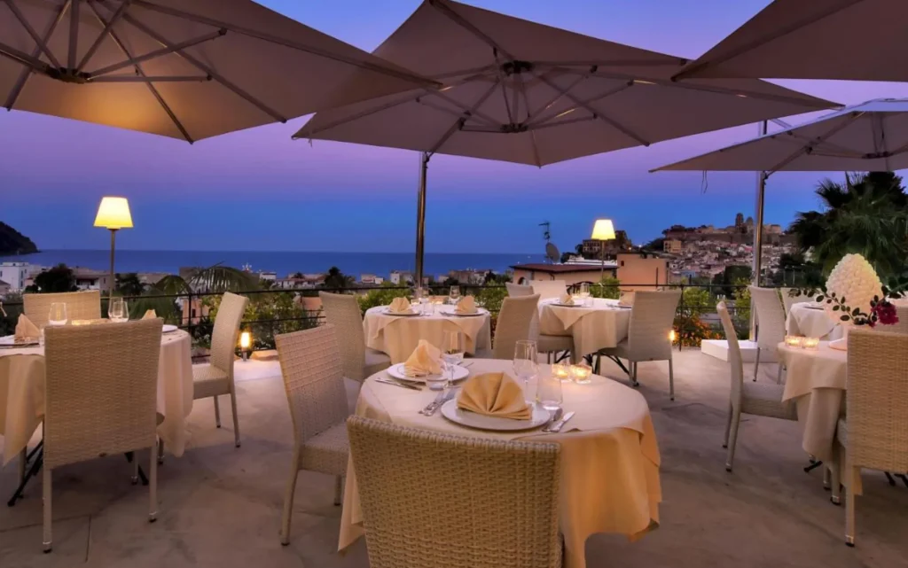 One of the hotel’s standout features is its stunning location, with panoramic vistas of the Bay of Marina Lunga and the imposing Castle of Lipari, creating a picturesque setting that captures the essence of this beautiful island. The hotel boasts 37 rooms, many of which are designed to maximise the incredible views. Most rooms overlook the sparkling waters of Marina Lunga Bay and the Castle of Lipari, allowing you to wake up each day to a serene sight of the sea and the historic castle perched above the town. For those seeking a more peaceful retreat, the hotel also offers rooms that are slightly removed from the bustle of the bay. These quieter rooms feature balconies that open onto the internal Mediterranean garden, a tranquil oasis filled with fragrant lemon trees, olive trees and lush greenery. The hotel’s restaurant is renowned for its use of fresh, locally sourced ingredients, many of which are grown in the surrounding Mediterranean garden or sourced from the island’s fertile land and waters. enjoy a variety of traditional Aeolian dishes, including freshly caught seafood, pasta made with island-grown ingredients, and locally produced cheeses and wines. Dine al fresco, with a table set in the garden or on the terrace, allowing you to enjoy the tranquil surroundings while savouring the exquisite flavours of Lipari. With its welcoming atmosphere, proximity to both the historical attractions of Lipari and the natural beauty of the island, the Mea Hotel is the perfect place to experience the charm and allure of the Aeolian Islands.